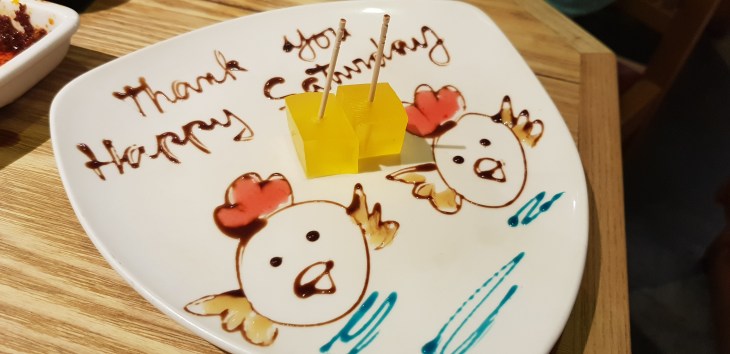 Finally they presented this extremely cute plate with 2 small jelly pieces for dessert.