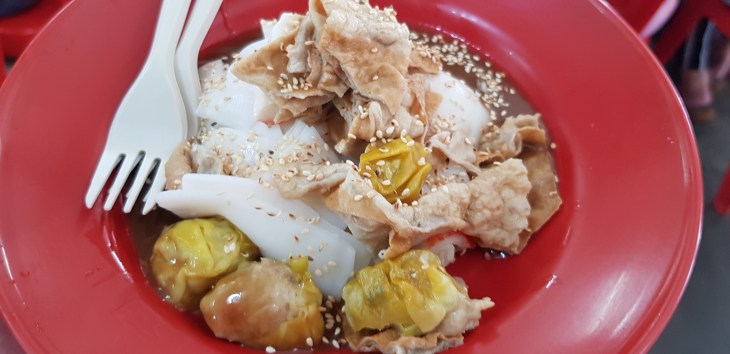 This is basically like our usual chee cheong fun with bean based sauce and white sesame except there are additional yong tau foo items added.