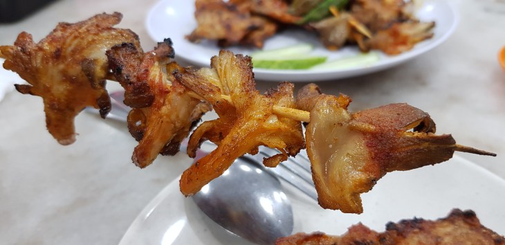One of the most popular is the chicken wings. Each skewer holds 1 chicken wing flattened and barbequed til golden brown and crispiness. The skin is heavily spiced and was extremely crispy. This is the perfect match to an ice cold beer.