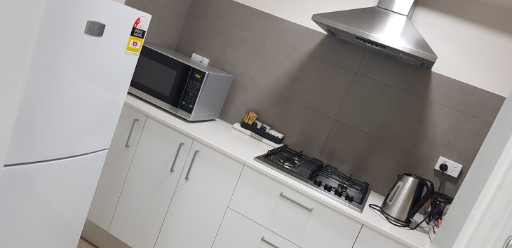 The attached kitchen is quite large and spacious. There are many amenities provided in the kitchen. A full-sized fridge, full-sized stove, a microwave, an electric kettle and a toaster. The basin is also equipped with hot and cold water. There are also 2 pots, 1 pan, 6 sets of plates and bowls and different kitchen equipment provided.
