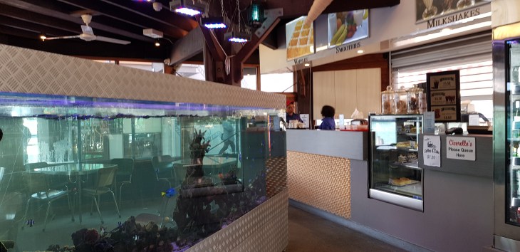 There was also a huge fish tank in the middle of the restaurant with sea coral fishes and a bar and cafe to the right side