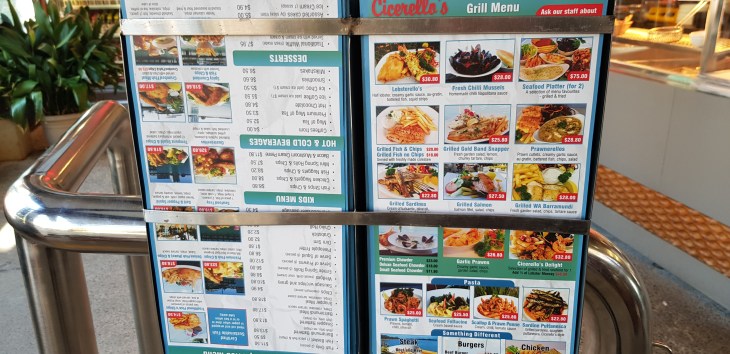 The Cicerello’s at Mandurah was just by the jetty and had great views. Right at the entrance was the order counter with the menu above