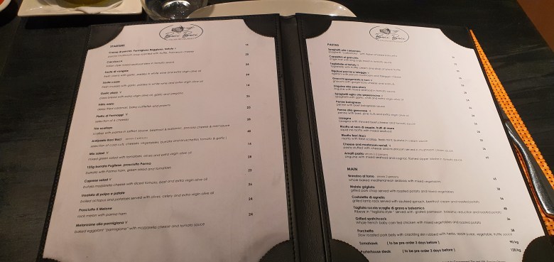 There is a huge selection of pastas and pizza as well as mains which are mainly meats and seafood. The dessert menu and wine is separate from the food menu.