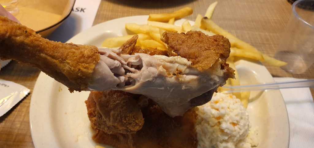 The wait for the chicken was pretty quick for about 5 – 8 mins and each meal was served on paper plates and fork and knifes although I ultimately used my hands to enjoy the chicken. Each meal comes with fries and coleslaw salad which is pretty similar to KFC.