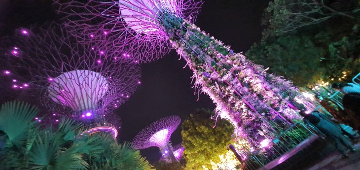 Immediately past the blue tunnel lights, you see the super trees all decked out in purple glow which looks quite futuristic.