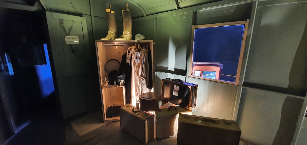 You can see a classic first class train cabin on display with some of the uniforms of the train staff.