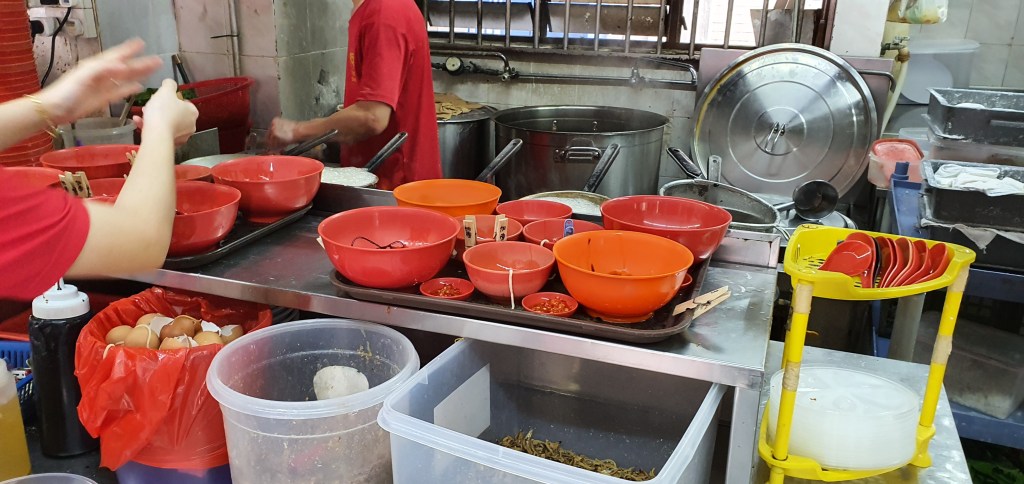 The stall is constantly busy as almost all visiting the Eating house orders their noodles. Customers can choose between pork, chicken, seafood or meatballs, thick or thin noodles, soup or dry and make their payment as the staff will serve you the noodles.