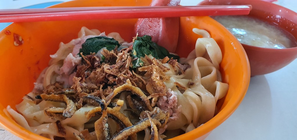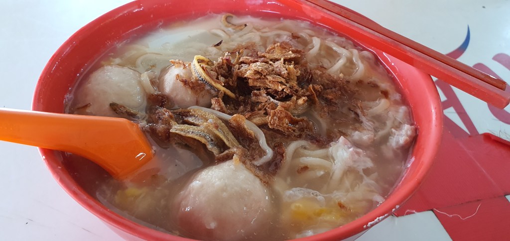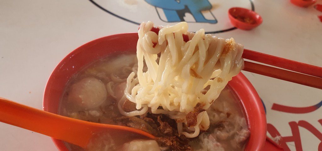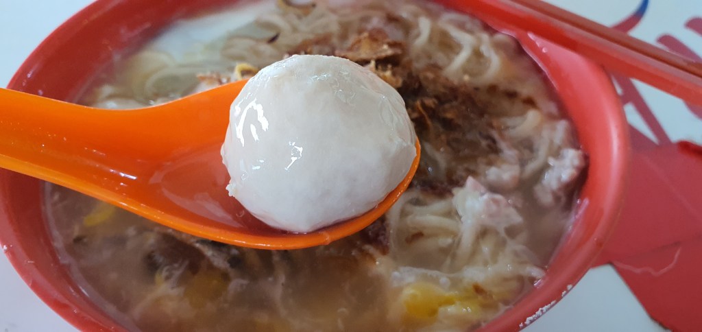 It took close to 10 – 15 mins before my noodles arrived. I ordered the fortune pork ball version which comes with fuzhou pork ball as well as minced pork meat with thin noodles in soup for SGD 5.50. The serving is the same as the usual hawker but the price is about 10% higher because of the pork ball. The bowl comes with the standard fried scallions and anchovies as well as an egg which was cooked with the soup.