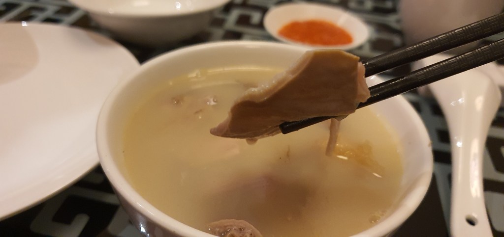 The stomach is stretched so much that it is very thin and soft to bite compared to the usual thick slices of pig stomach which could be difficult to chew on. The soup is boiled to a light milky color with strong sweet flavours and light peppery taste from the chicken, stomach, dried scallops and some Chinese herbs. We each had 2 to 3 rounds of soup between 4 of us.