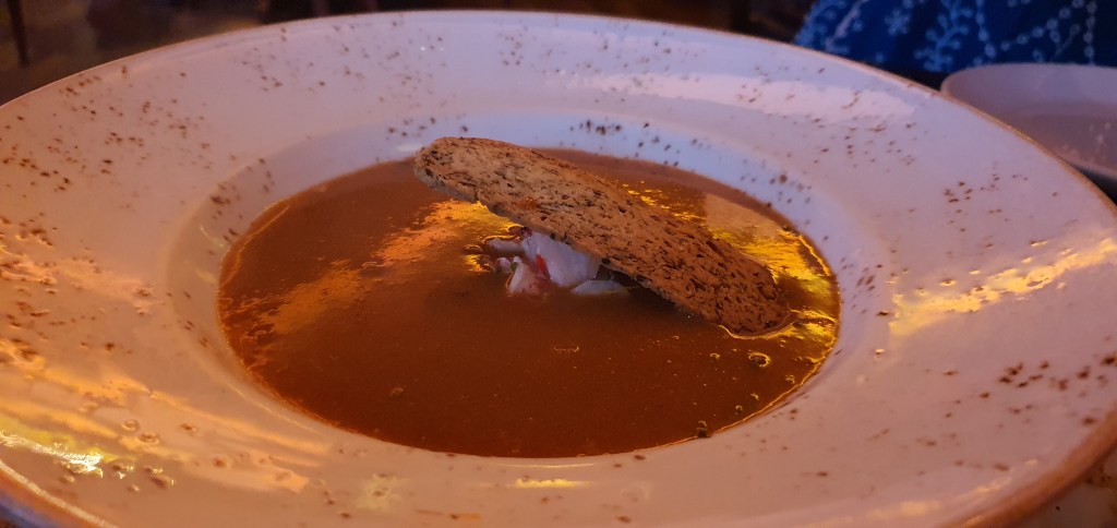 For starters, we had the spicy lobster bisque which was priced at SGD 25 which is somewhat standard for rooftop restaurant. I would have preferred if the serving was slightly more generous. The flavours were also quite mediocre with a very light seafood taste and kick of spice. The umami of the lobster did not come through in the bisque.