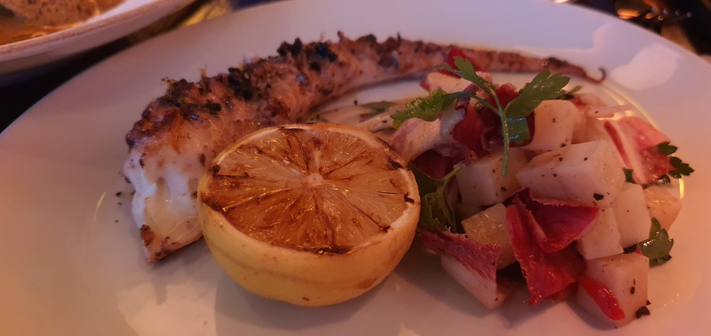 The nest dish we had was the charred octopus at SGD 29 which came with a side of celery and endives salad. The lemon half was grilled so the acidity was greatly reduced, leaving only the slight tangy sweetness of the lemon. The serving was 1 medium sized octopus tentacle which is small compared to other octopus dishes I had elsewhere. In terms of flavours, there was just sufficient charred flavour on the surface of the octopus leg while still keeping the flesh soft.