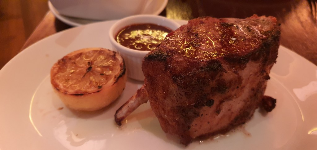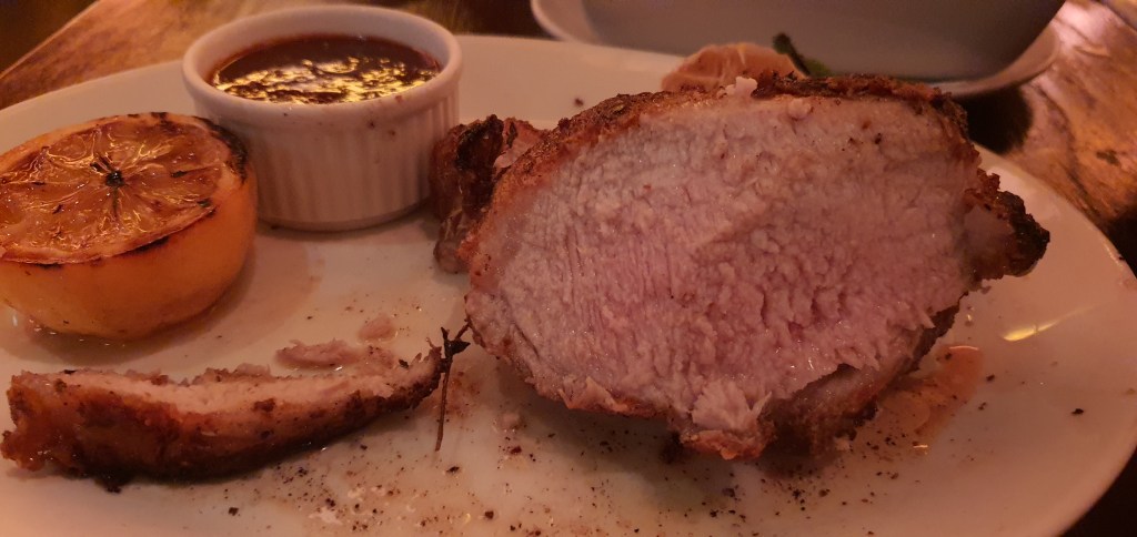 Lastly, we had the pistachio iberico pork chop which took awhile to prepare. Priced at SGD 52, the serving was quite huge so I would say the price point is quite reasonable. When served, I could smell the nice charred scent from the skin of the pork chop.