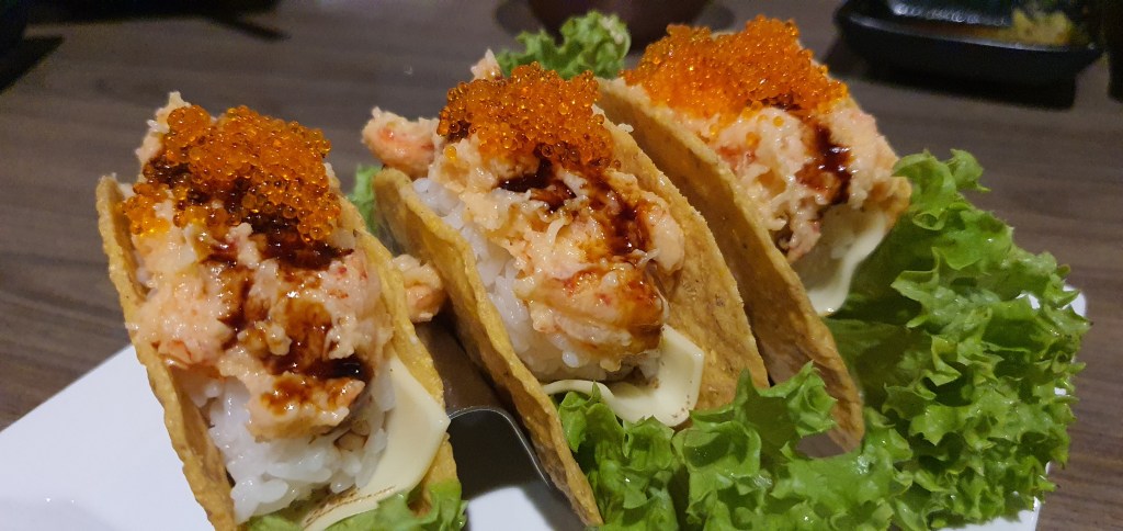 I was surprised to see this on the menu as it sounded more mexican than Japanese. I liked the innovation of using taco shells instead of the usual seaweed which gave the entire piece a good crunch texture. As the taco breaks when you bite into it, it does not hold onto the rice and lobster salad well which could make eating a little messy. The taste of the lobster salad however is perfect with huge chunks of lobsters and a nice mix of mayonnaise and ebiko.