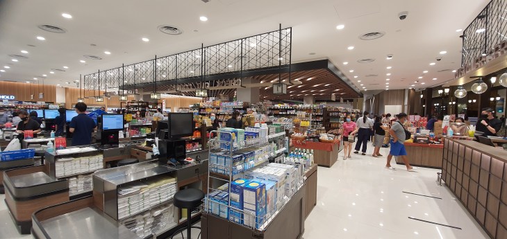 To get to the international supermarket, you will pass the checkout counters which are just next to the pharmacy.
