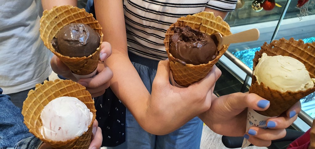We ordered the dark chocolate sorbet, lychee raspberry and pistachio as seen here. Each single scoop costs SGD 4.70 and double scoop for SGD 7.70 while an extra $1 for the thyme cone. Firstly, the cones are freshly baked and are very well done, it is crispy and buttery with a light tinge of thyme flavour which the kids are not a fan but I loved how it balances the sweetness of the gelato. The texture of the gelato itself is very creamy and smooth and the overall sweetness of all the flavours are very balanced without anyone that is too much. The dark chocolate sorbet has a small hint of bitter notes from the dark chocolate but was not overwhelming. The lychee raspberry and pistachio were both very creamy and while the raspberry was very refreshing, the pistachio had a nice earthy nutty taste.