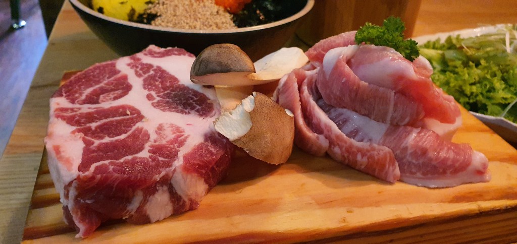 My eyeballs were immediately attracted to this visual when the server served the meats we ordered for the bbq. As a lover of pork jowl, I ordered 1 portion and another portion of black pork collar both priced at SGD 25. I have never seen a pork collar steak this thick in Singapore in the restaurants I have visited so far so I was very excited to try this as it brought back memories of the fantastic bbq I had in Seoul.