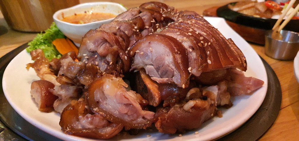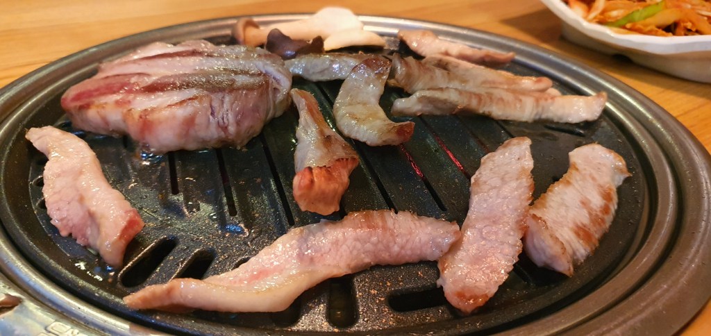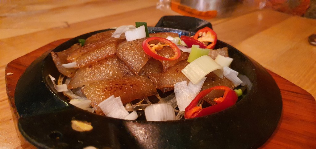 Another dish we see often in Kdramas is the grilled pork skin and I expected the skin to come raw and we can grill it ourselves. However, the dish came pre-grilled on a hotplate with leeks and chilli. The dish was quite a disappointment as the skin was quite rubbery and cold when we received it