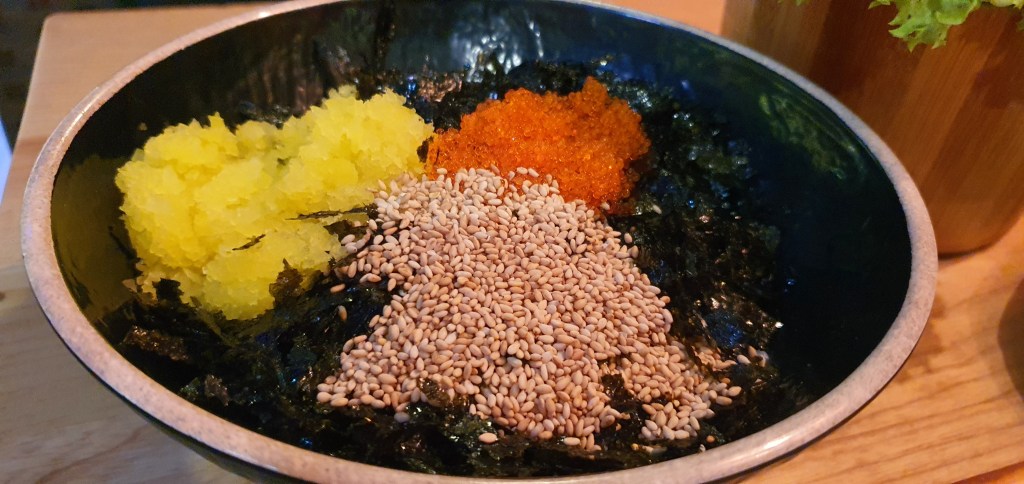 The first item I ordered is something I always see in Kdrama and never tried so I decided to order when I saw it on the menu. This is the DIY tobiko seaweed rice which is rice served in a bowl topped with colourful tobiko roe, roasted sesame seeds and seaweed.