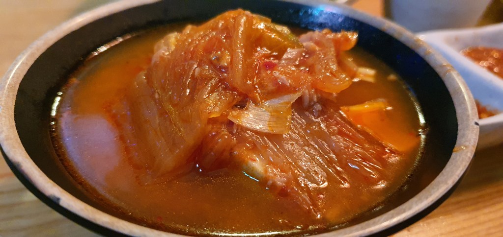 Lastly, to wash it all down, we had the kimchi soup which was served in the usual hot clay pot bowl. I did not take a picture of the original bowl it was served in as we had to make space on the table for more dishes so we hurriedly portioned out the soup. I like that the soup had a decent sourish tinge from the over-ripe kimchi used and there was a nice savoury balance