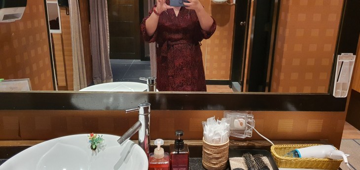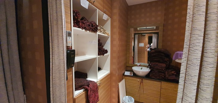The dressing room also provides hair dryer, hair brush, disposable one time use comb as well as some amenities like hand cream and moisturizers. The spa set pass to me was maroon color for female and gold for male and consist of pants and a kimono styled top