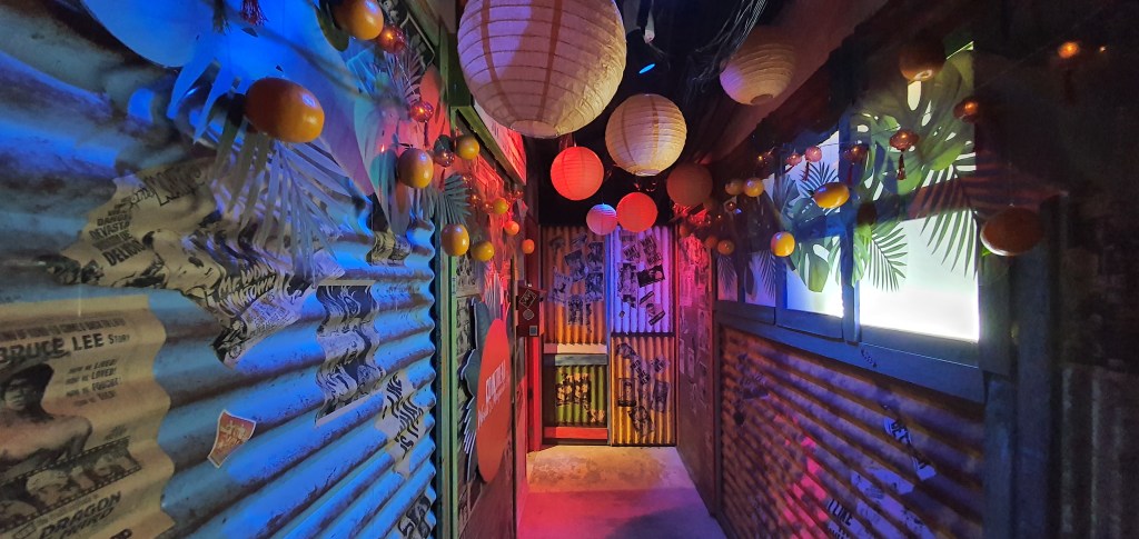 Past the secret door, you are led into this colorful and eclectic looking tunnel decorated with with both elements of the 70s and Shanghai China high society lanterns