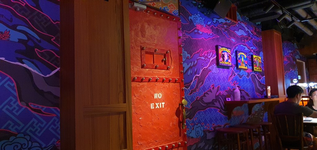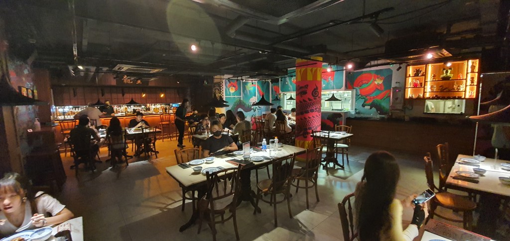 Pass the tunnel, you are welcomed into this spacious area which is somewhat like a Chinese restaurant with an underground vibe due to the raw cement floors and ceiling complete with raw piping. You can see the incorporated Chinese styled paintings and wall decorations at both the bar counter and the main kitchen service window area