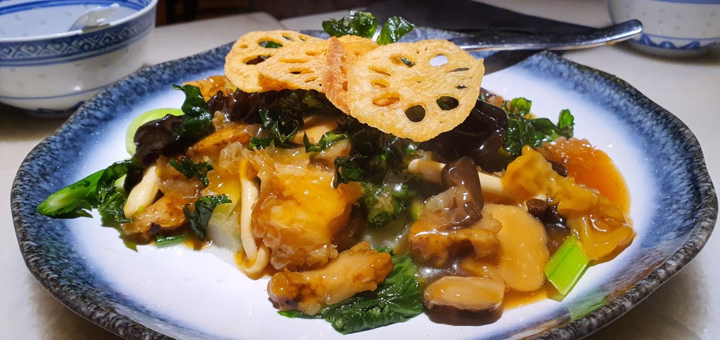 Most of the dishes like the firecracker chicken or fish were all sold out so we fell back on the server’s recommendation and they included this popular choy suey which is a fried medley of bok choy, kale, black & white fungus, enoki mushrooms, lotus root chips and kai lan. The vegetables were still crunchy and the savoury gravy made this dish perfect with a bowl of rice. However, on it’s own, I found it on the salty side