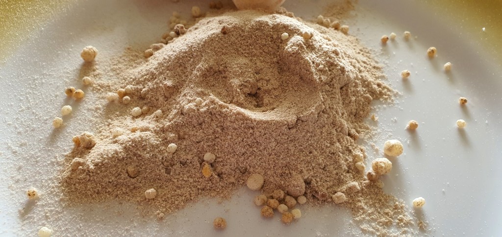 I took one of the Injeolmi pouches and poured out the contents which includes powdered milk, muesli, cereal, multigrain, soybean powder, vitamin A,B,C and E. The powder is very fine and I do not see any sugar in it. The round pearly bits are the cereal and muesli