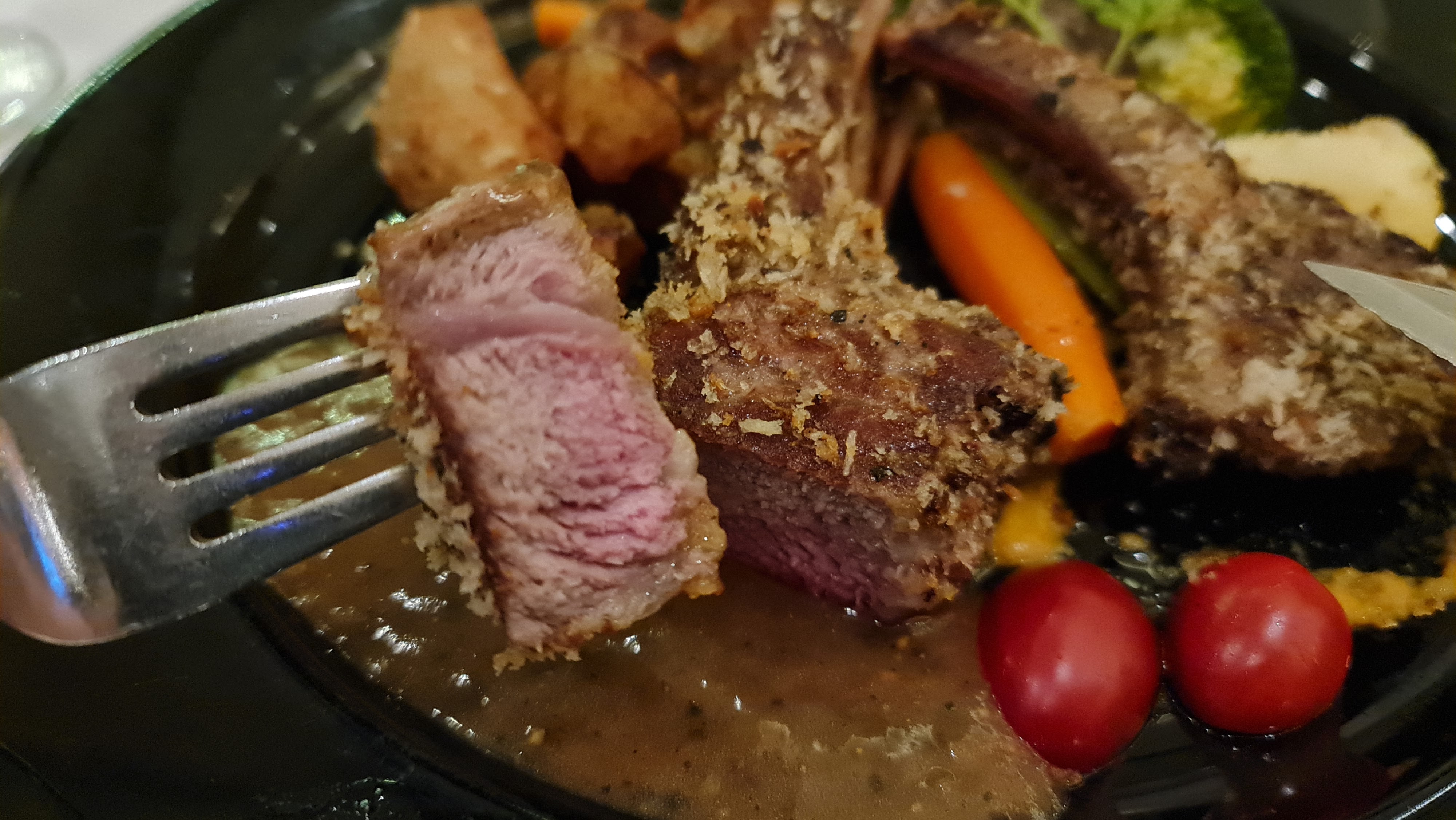 Since I do not take beef, I went for the next closest which was the truffle rosemary crusted lamb which was served with seasonal vegetables, potato wedges as well as baby carrot puree. The lamb was priced at a premium price of SGD 85 with only 3 lamb rack pieces