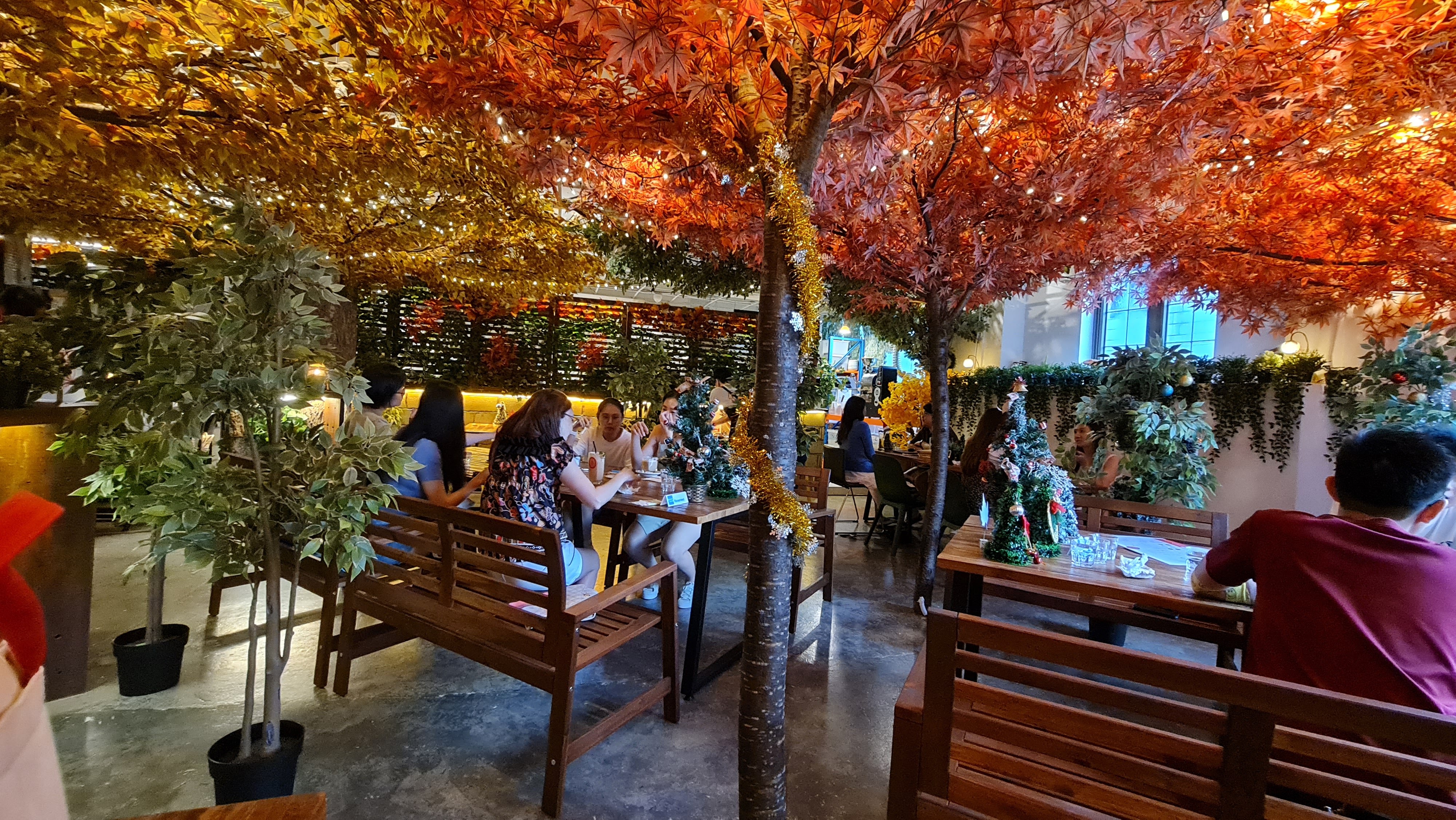 Decorated like an outdoor garden, the cafe seating is almost like the wooden park benches and picnic tables. To complete the look, artificial trees with autumn colours are planted throughout the cafe to give it that warm golden hue to mimic autumn in a park