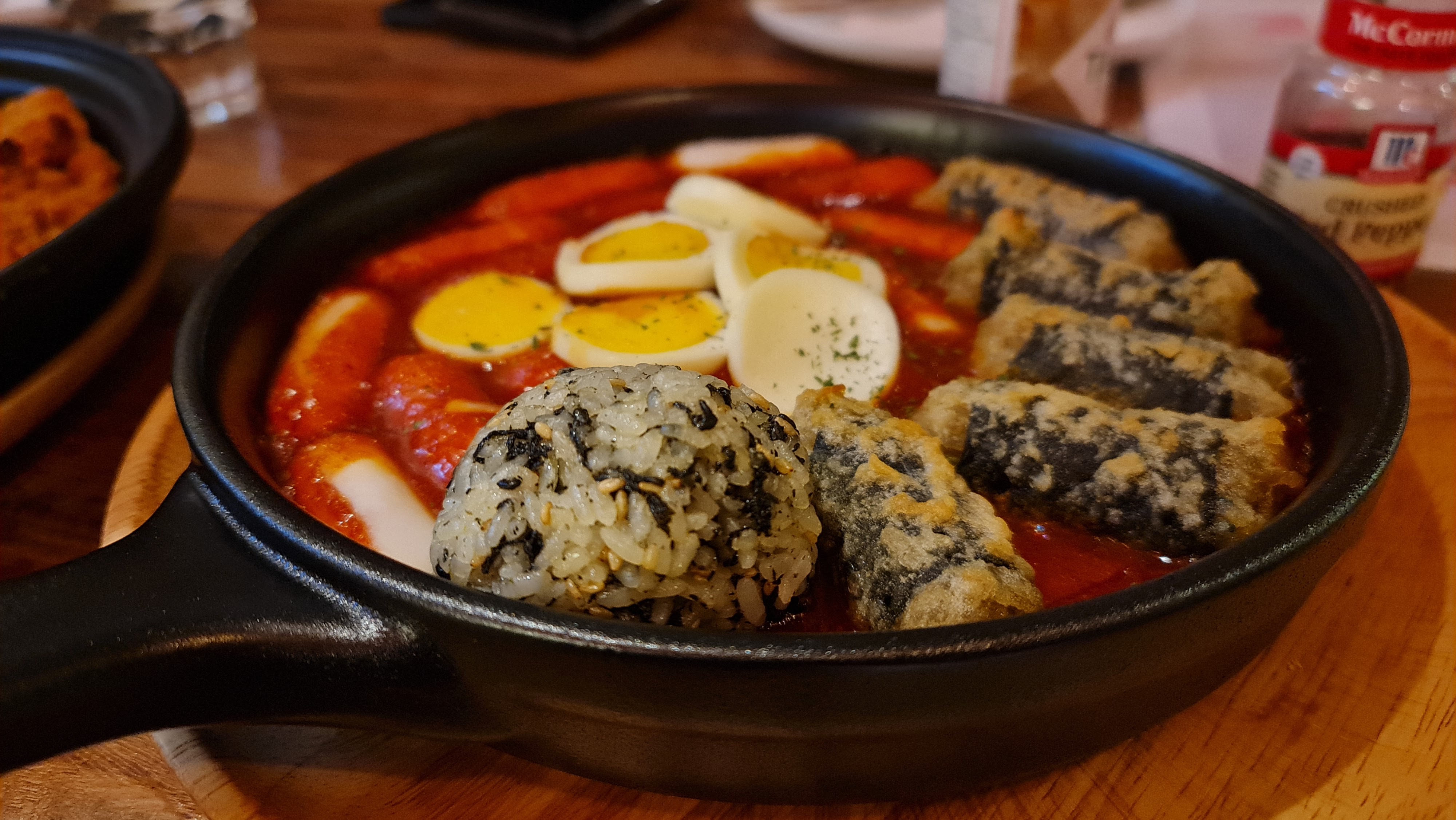 The last dish we ordered was the Tteok-Bokki hot plate which has mild spicy cheese rice cakes and fried glass noodles wrapped in seaweed, served with Korean seaweed rice ball and hard-boiled eggs. This is in fact my favourite dish on the menu and the most Korean in nature.