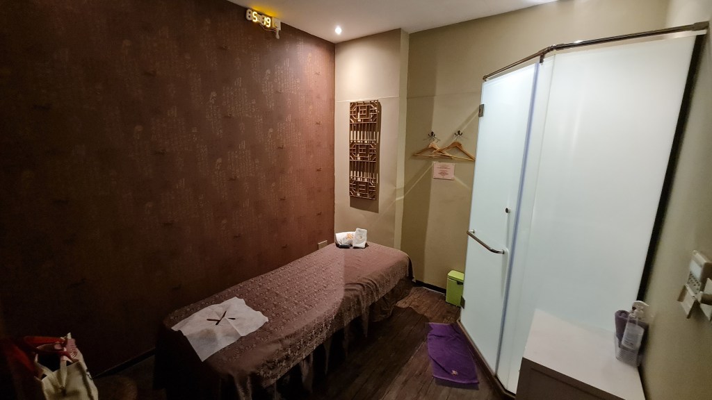This is my massage room which comes with a shower facility and a few hangers for you to hang your clothes. There is no cupboard or locker to put your bag or belongings so I ended up hanging it on the hanger area