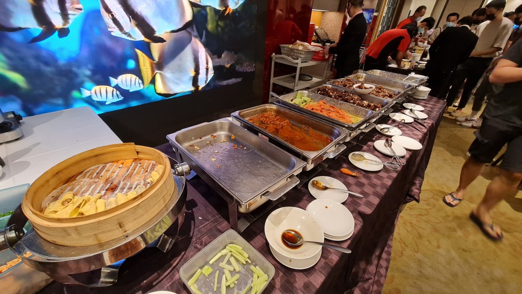 The self-service buffet line was set on the right side of the restaurant serving wrapped Peking duck in egg wraps, fried salted egg yolk prawns, Chee Cheong Fun ( steamed rice rolls), sweet and sour pork ribs, black bean fried fish, fried bee hoon, spicy chicken feet, pork congee and desserts. I only managed to take a picture of the buffet line after the crowd dispersed as it was almost a war zone. During the initial 20 mins, there were staff stationed at the buffet line to hand out the dishes to customers. As the manager told me later on, this is to prevent a mad rush at the beginning. Once all the customers have settled, the buffet line is self service
