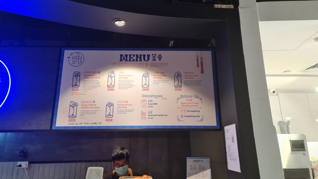 The ones offered here at Crispy Bing include both meat and vegetarian options; where the meat options have roasted duck, char siew pork and spicy crayfish as toppings. Those looking for non-meat options can go for the plain or plant-based chicken versions. Those who have a sweet tooth can go for the sweet banana version