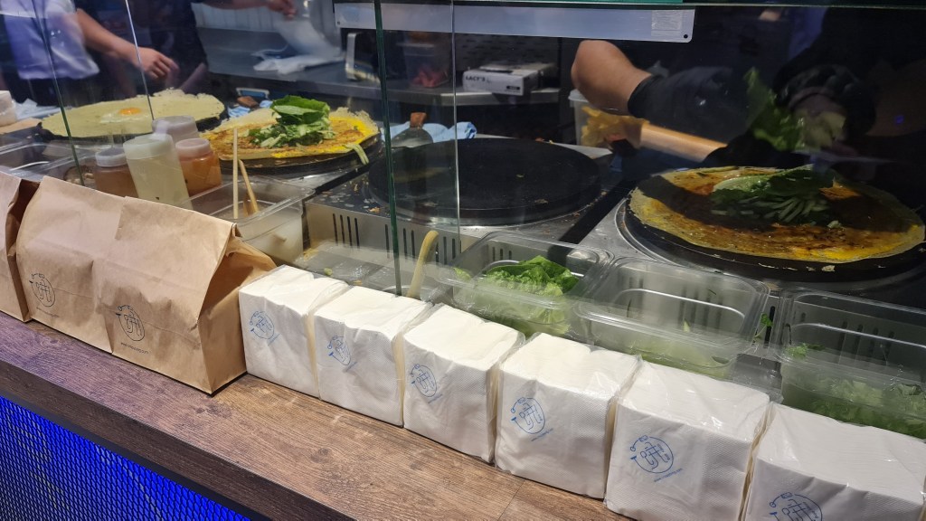 Imagine my delight when I chanced upon this takeaway stall in the basement of One Raffles Place selling Chinese crepe pancakes. Known as Jian Bing, these crepes are one of the most popular breakfast options in China. With almost every neighbourhood boasting their own favourite Jian Bing vendor, these crepes are made from wheat and mung bean flour base, topped with eggs. fresh vegetables, the meat of choice and crispy wonton skins. Originally from Shandong or Tianjin province, these are now found widely in China with a slight variation in flavours depending on the region