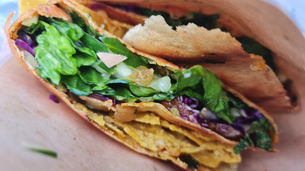 The traditional Jian Bing is made of mung bean crepe coated with scrambled egg, sesame seeds, scallions, hoisin sauce, crispy chilli sauce, fresh cucumbers, salad greens, cilantro and crispy wantons