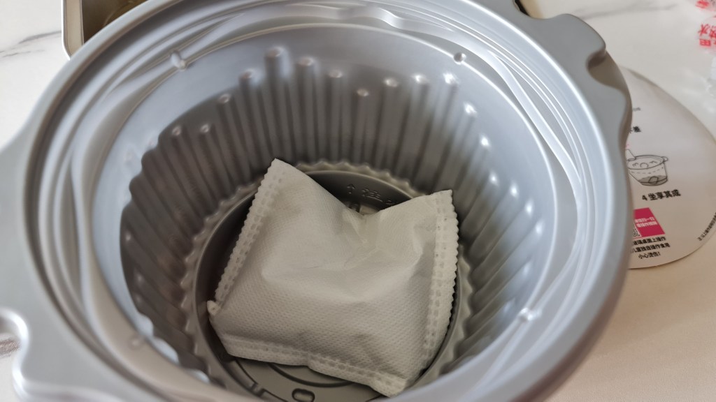 Next, place the self heating pack at the bottom of the lower pot and fill it up with water, before the heating pack start bubbling, place the top bowl with the rice onto the bottom pot and cover it with the given plastic cover. Now you just have to wait for 10 mins or more depending on the instructions