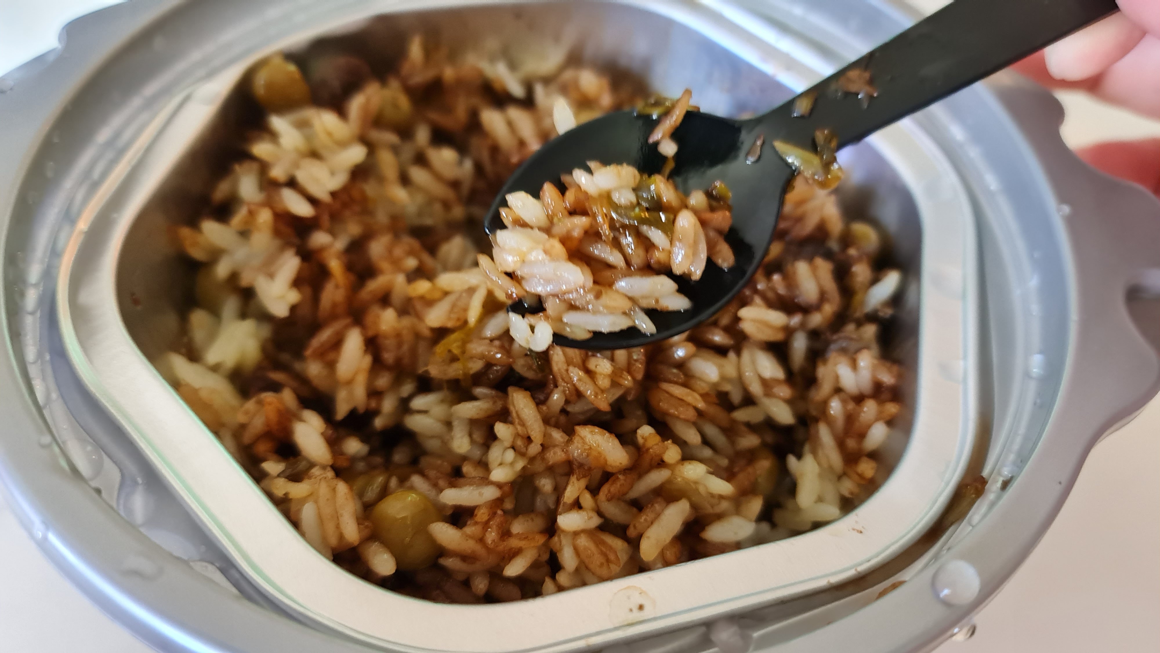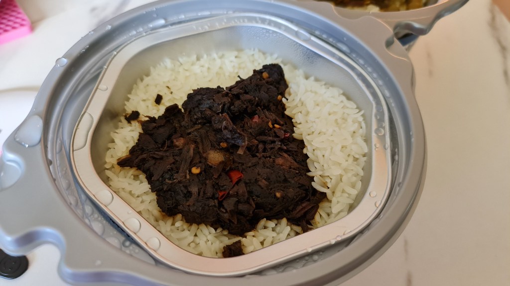 The one on the left is the preserved vegetable with braised pork while the one on the right is the preserved vegetable with pork. At this point, the heating pack is still smoking and can be hot, so do be careful while eating or stirring the rice