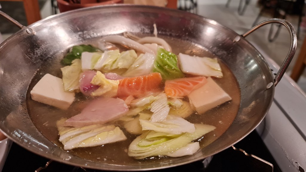 To wash it all down, we order the individual hotpot at SGD 16 which has a selection of soup base to choose from; prawn shio, shrimp miso and spicy miso. The individual serving came with Chinese cabbage, tofu, yellowtail, squid and salmon. You can choose to order extra ingredients to cook in the hotpot. The soup base is quite bland in flavour but the ingredients are fresh enough with no complaints