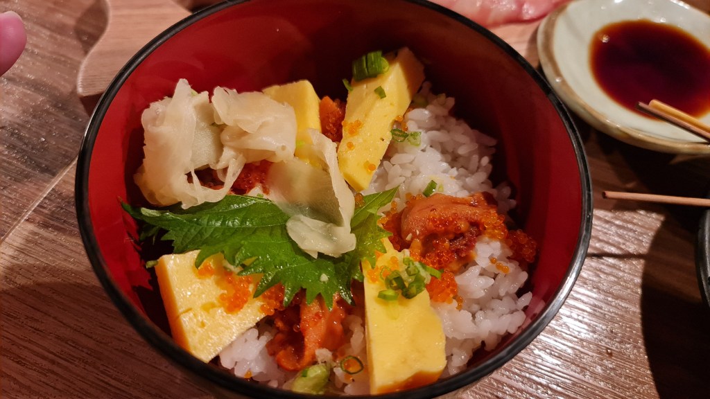As a lover of sea urchins, I order the mini Uni rice bowl which came with a very pathetic serving of uni. The bowl came with 4 slices of Tamago and 4 small teaspoons of uni