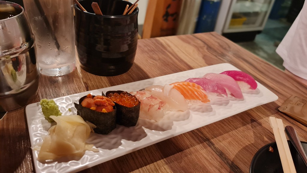The sushi platter we had consisted of 8 pieces of sushi and a side serving of pickled ginger. The rice was quite dry and hard although the fish was fresh enough. The sea urchin had a metallic taste which I dislike so I did not finish the sushi