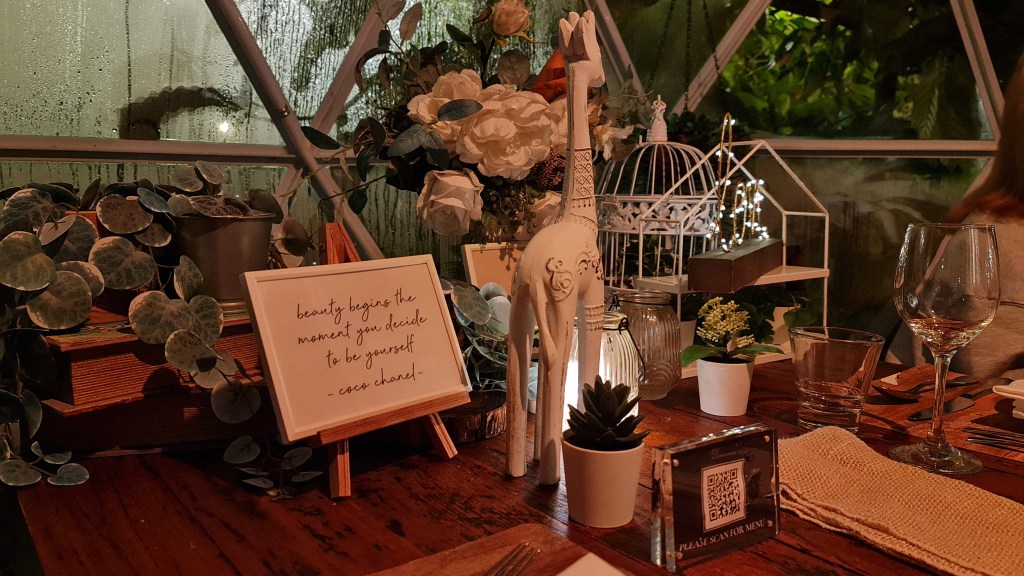 We decided to splurge and booked a private dome at the garden dome area which is part of the Summerhouse dining house. Set within the lush edible garden, there are only 3 private domes available for booking. Each dome also comes decorated in different concepts; Bohemian, Scandinavian and Lounge and are fully air-conditioned with their own blue tooth speaker and fairy lights