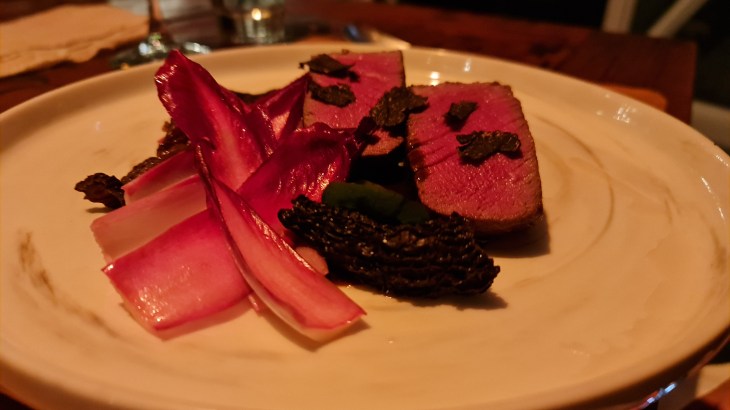 For mains, there was a selection between pan-seared black cod and home-Smoked Angus Tenderloin. The cod came served with barley risotto and crustacean herb foam which has concentrated seafood umami flavours. The fish was fresh and had a slightly smokey flavour from the seared surface. The flavouring of the fish itself is light so it is best to pair it with the foam. The beef was served with marinated red chicory seasonal black truffle and morel poivrade which is a kind of mushroom. My friend commented that the beef was tender with a pink inside but not the best they have tasted