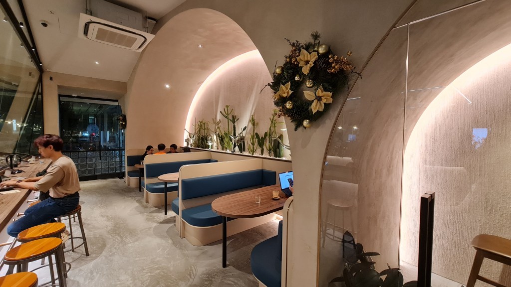 The huge 3,000 square feet space includes the main cafe area where the coffee, gelato and snacks counter is located. The design is minimalist but spacious and cosy at the same time