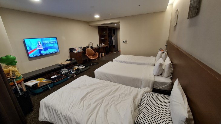 Next to the desk is a long TV console panel but as the TV was fixed to the wall, we use the panel as storage for our shopping. With our 28-inch luggage opened fully in front of the panel, there is still ample space to walk around in front of the beds. The bed is semi-hard and not too soft which is comfortable for me. However, I did find both pillow slightly too soft but was perfect for my 2 roommates. In terms of power sockets, only the beds at the 2 ends had power points for charging phones but there are more points at the desk area which can be used as well
