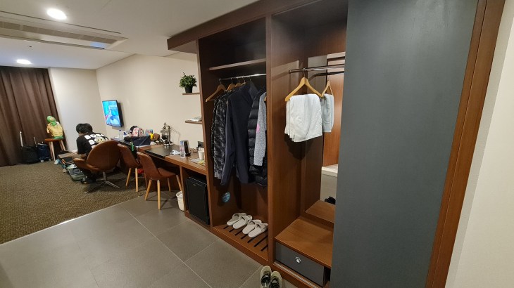 I booked a triple room and am very pleased with the size of the room. From the entrance, there is a huge wardrobe with more than enough hangers for 3 guests. There were also slippers provided for guests to use. There is a safe deposit box at the bottom of the wardrobe for keeping items. Next to the wardrobe is a long working desk with 2 leather seats. The table is so spacious and long that we used it to put our cosmetics, food and snacks as well as use it as an eating area.