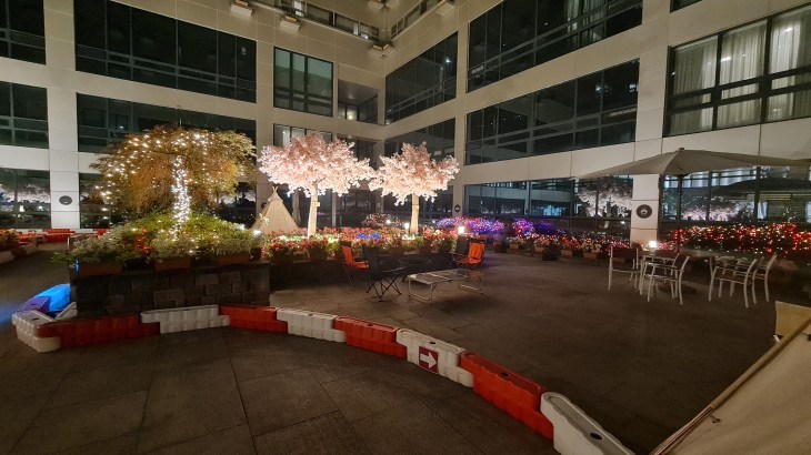 Also located on the 14th floor is the self-service coin-operated laundry room, a 24-hour C U convenience store, a business desk for printing services, a spa and massage, a fitness centre, seminar and conference rooms, a restaurant and an outdoor courtyard which is set up like a race track. You can race around the track only from 11 am to 8 pm. At night, you can sit on the chairs provided for drinks bought at the convenience store and relax in the beautifully lighted courtyard