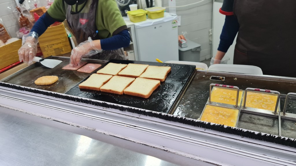 All sandwiches are made freshly when orders are put in, as this outlet is located in the tourist area, the 2 Ahjummas could understand basic English so ordering was not an issue. There are 2 hotplates, one for toasting the bread, one for the omelette eggs and another for ham and other ingredients