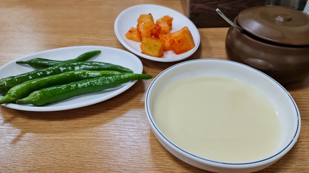 After putting in our orders, we were served a plate of green chilli and cream soup. There is a pot of radish kimchi at every table for customers to serve themselves. The cream soup did not look appetising when it was first served and was quite diluted and not thick. Surprisingly when I tasted it, it was very delicious and reminded me of homemade cream soup which was simple yet heartwarming