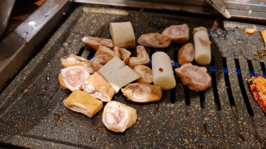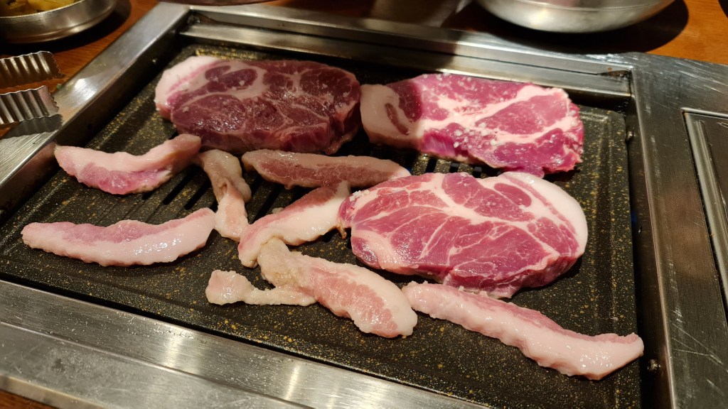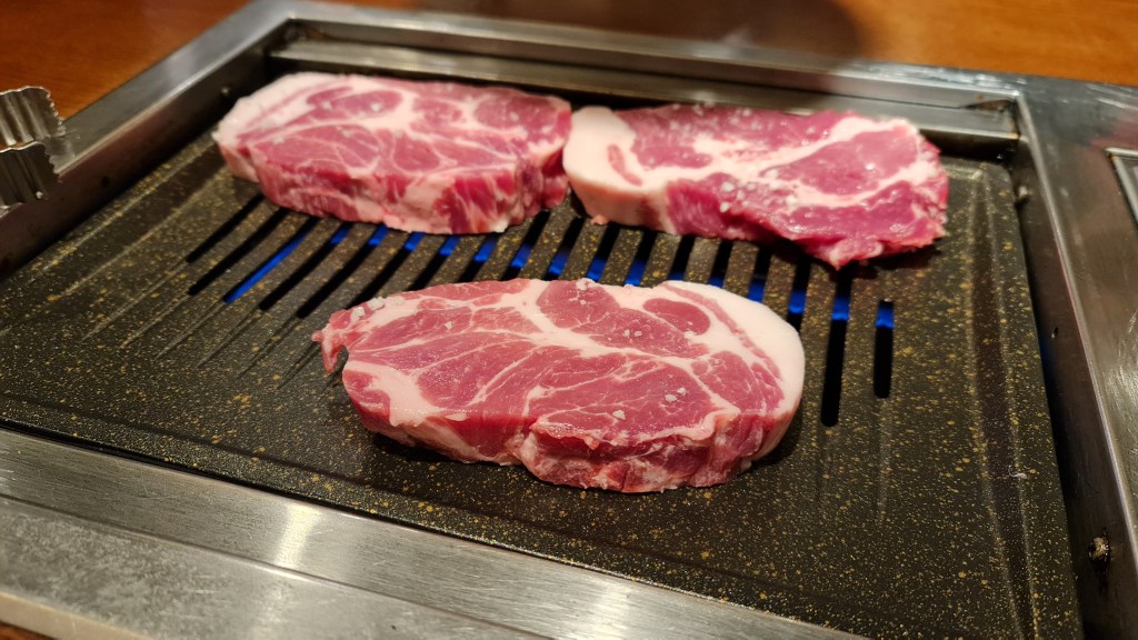 Our meat arrived and it looked like pretty premium cuts. Our order mainly consisted of the pork jowl and the pork collar as those were our favourite cuts and the price was quite affordable. We had to grill our meats as the staff was quite understaffed and busy with service and checking the bills. The customer turnover of the restaurant was relatively high as you see satisfied customers leaving and new ones taking over the tables very frequently